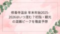 混雑のピークは1月2日・3日で、開園直後から正午頃までが最も混み合います。穴場時間は開園時間ちょうどか、午後2時以降です。また1月4日以降は混雑が大幅に緩和されます。